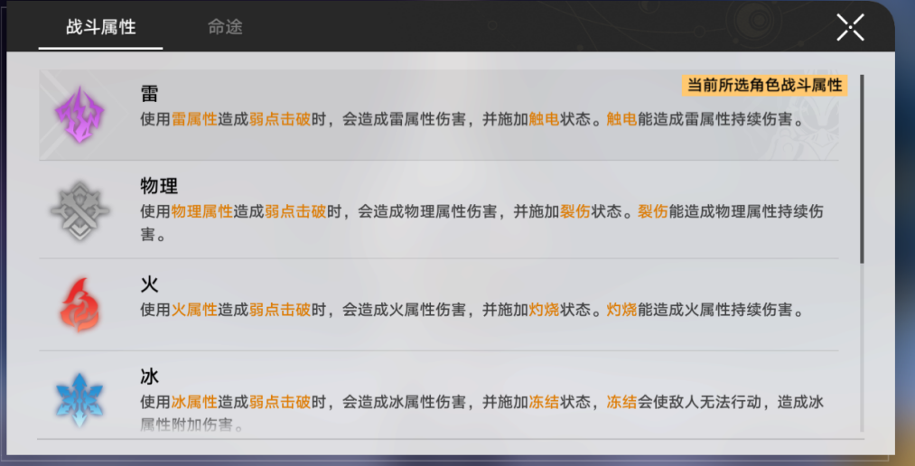 而人物的属性决定了其攻击属性,只有攻击敌人的弱点属性才能削弱敌人血条上方的韧性条,击破韧性条后敌人会被打断动作陷入硬直,受到的伤害增加,一回合后恢复。