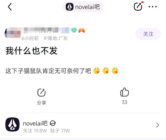 大家不再讨论如何用NovelAI生成涩图,而是自发组成了一支和“AI队”对抗的“人工队”(由于选择的是猫和老鼠中的画面,所以也叫“猫鼠队”),开始研究起了怎么用《猫和老鼠》来进行人工“跑图”。