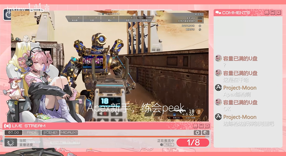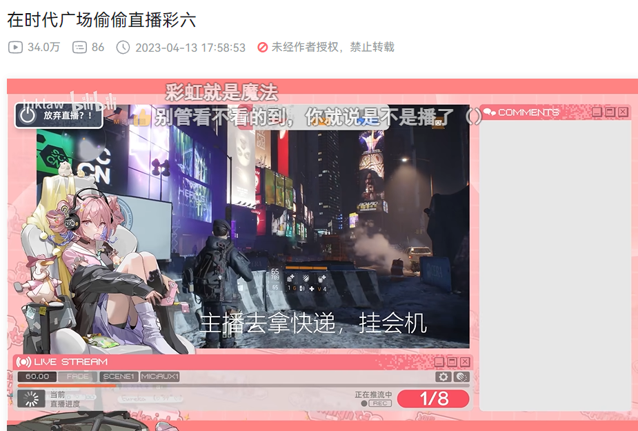 在没有经验的时候,大伙应该跟我一样,很难发现这是在直播彩虹六号。在直播间打上一行字幕“主播休息/吃饭去了,等下”,只留下自己桌面的动态壁纸,然后悄悄地在壁纸中的某块小屏幕里直播。