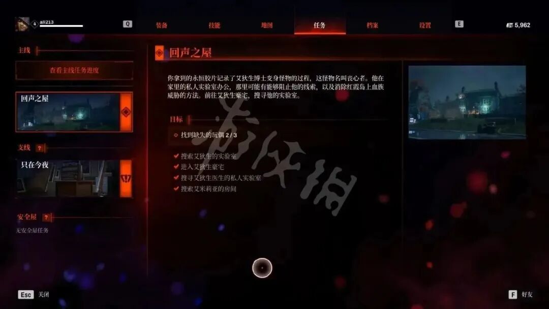 《红霞岛》的任务和剧情一样无聊,简单的说就是去某地解决某人和去某地寻找某物,支线任务也是如此。可能有人会说《求生之路》不也一样,但《求生之路》在执行任务的过程中你可以感受到来自僵尸的压迫,《红霞岛》的跑路过程除了空旷还是空旷。并且在寻找任务物品的过程中游戏不会给到任何引导,“回声之屋”需要玩家寻找三个布娃娃,由于没有指引我从游戏的天黑找到天亮依旧还差一个,真是找的要吐了。