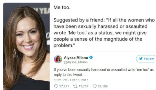 Me too运动,是美国一位女星Alyssa Milano针对制作人Harvey Weinstein侵犯多名女星发起的维权运动。
