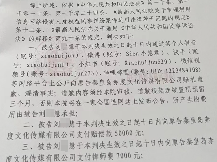 在“小慧君”事件有了定论之后,她所得到的惩罚是“道歉、澄清事实,并且赔偿赤度文化公司5万元,承担其支付律师费7000元。”
