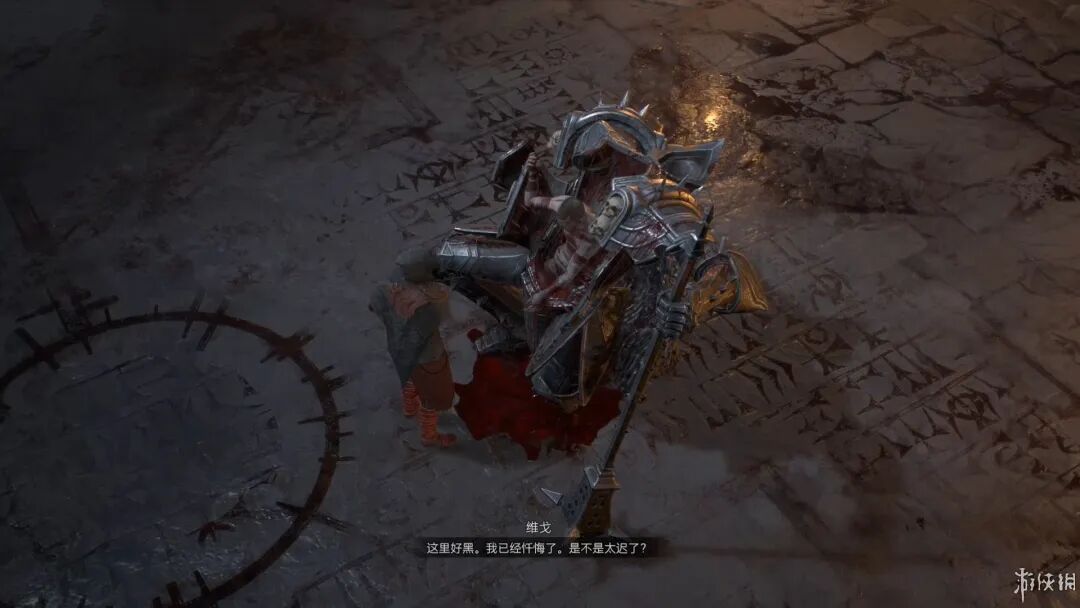 然而就在这样一个与前几作相比有点小打小闹的故事中,D4对人物的塑造以及各个宗教派系的刻画描绘却相当出色,例如在第一幕中初次觐见天使伊纳瑞斯时,我能切实体会到他那流淌在血液中的傲慢与自负,而他这种性格特点也恰好投射到了他的信徒身上,以至于整个圣光教自上而下都体现着一种盲目狂热的病态信仰,而这种病态信仰在维戈(第一幕中同行的圣光教骑士)身上得到了充分体现,他因为自己的工作疏忽导致整个骑士小队惨死于恶魔手下而感到愧疚不已,尝试忏悔却未能得到天父伊纳瑞斯的回应,在第一幕最后与Boss“莉莉丝的挽歌”战斗中,他穿上像铁处女一样的忏悔骑士铠甲帮助主角击败魔物,用生命完成了自我救赎。