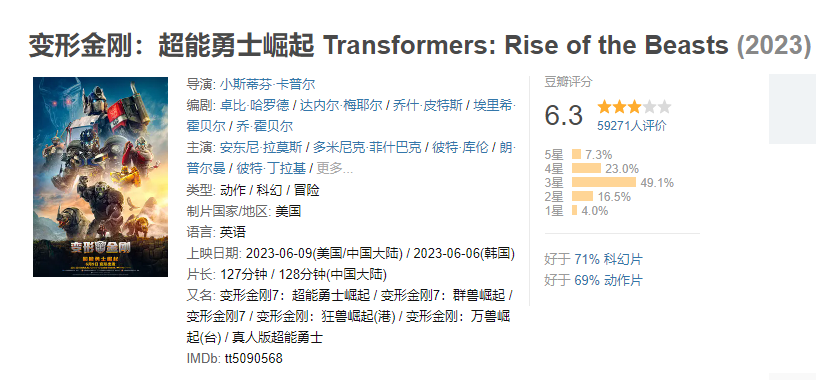 从豆瓣评分也能大致看出本身的质量。不过,作为一个更看重打斗场景酷炫与否的观众,我对于《变7》的评分绝对是要比平均分更高一些的。其他观众的吐槽也几乎都集中在人物塑造,刻画上面,至于电影综合质量是个什么样,还是值得跟大伙仔细聊聊的。