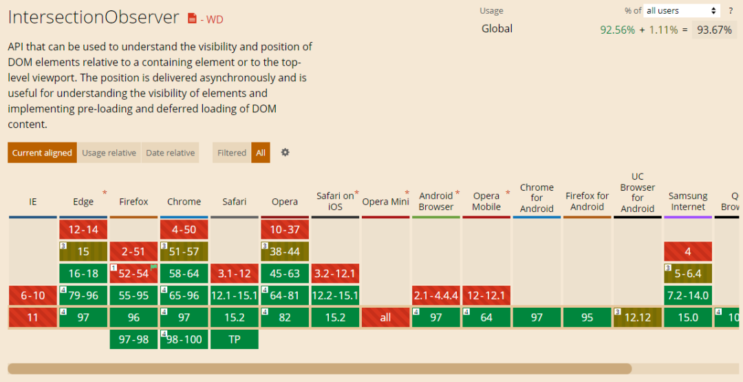 caniuse 兼容性报告目前支持率是 93.67%,但是iOS的支持度要在 iOS12.2 以上,如果是iPhoneX(2018.11)之后的手机都是支持的,如果是之前的,升级系统才支持,考虑到一些人是不会升级,所以这个兼容性还不支持大众化的场景,但它的能力和性能都非常的好