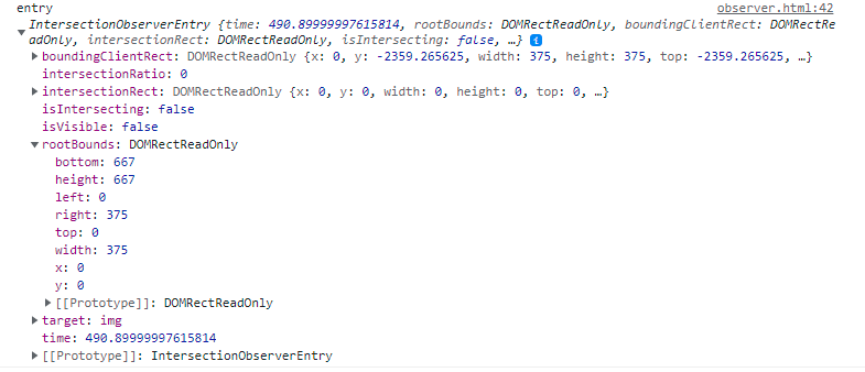 rootBounds:根元素的矩形区域的信息,getBoundingClientRect() 方法的返回值,如果没有根元素(即直接相对于视窗滚动),则返回null