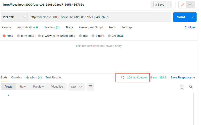 添加了一些用户并登录,将 Token 添加到请求头中,使用 DELETE 删除用户,能看到 状态码变成 204,删除成功