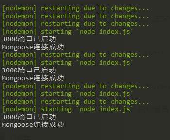 启动服务 npm run serve,即 nodemon index.js,能看出 mongoose 已经连接成功了