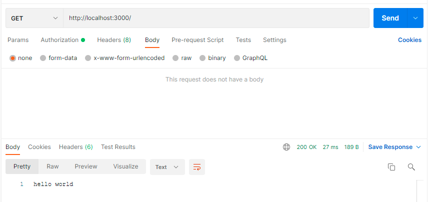 const Koa = require('koa')const app = new Koa()app.use((ctx) => { ctx.body = 'Hello World'})app.listen(3000, () => { console.log('3000端口已启动')})