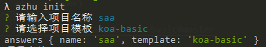 inquirer .prompt([ { type: 'input', message: '请输入项目名称', name: 'name' }, { type: 'list', message: '请选择项目模板', name: 'template', choices: ['koa-basic'], }, ]) .then((answers) => { console.log('answers', answers) })
