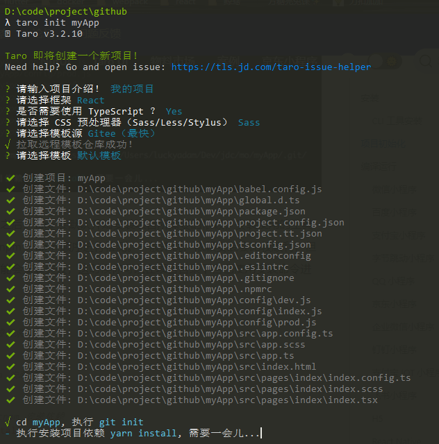 看 create-react-app[5]、 vue-cli[6]、@tarojs/cli[7] 的各自的仓库,我们能得出一些共同点,例如多套模板、友好的交互、优美的 UI 等等。我们这里以 taro 为例,先用用,看看,再仿着做一个