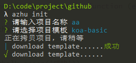 ....then((answers) => { console.log('正在拷贝项目,请稍等') const remote = 'https://github.com:johanazhu/koa-basic#master' const tarName = answers.name + const spinner = ora('download template......').start() download(remote, tarName, { clone: true }, function (err) { if (err) { + console.log(chalk.red(err)) spinner.fail() } else { + console.log(chalk.green('成功')) spinner.succeed() } })})