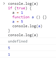 console.log(a)if (true) { a = 1 function a() {} a = 5 console.log(a)}console.log(a)