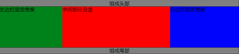<body> <header>组成头部</header> <section class="container"> <div class="main"> <div class="middle">中间部分自适</div> <div class="left">左边栏固定宽度</div> <div class="right">右边栏固定宽度</div> </div> </section> <footer>组成尾部</footer></body>