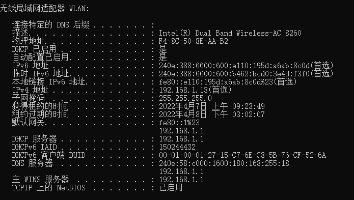 你也可以通过 ipconfig /all 来查看你的所有地址