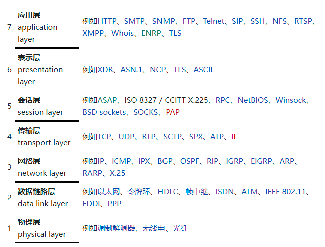OSI 模型分成了七层,分别为物理层、数据链路层、网络层、传输层、会话层、表示层、应用层