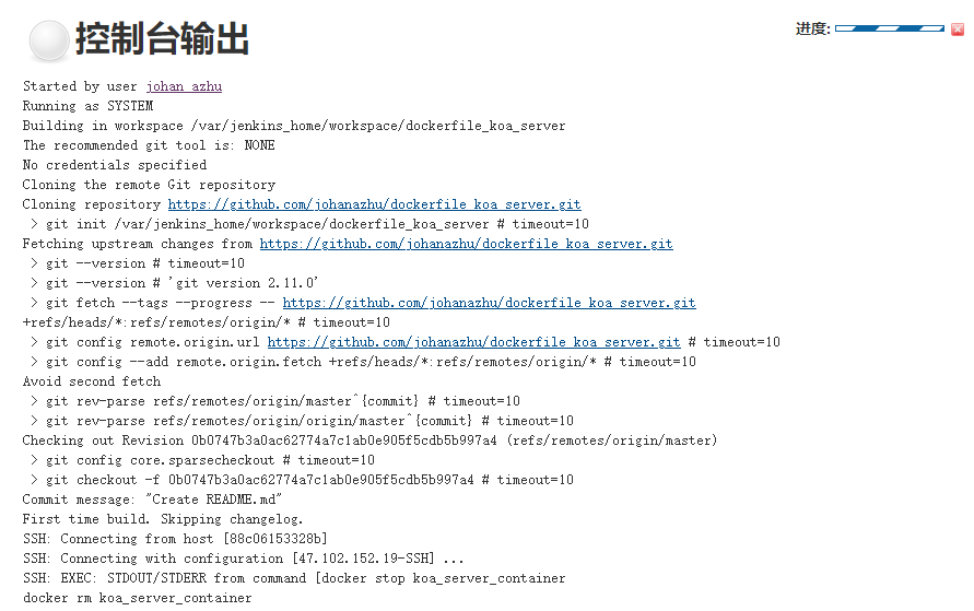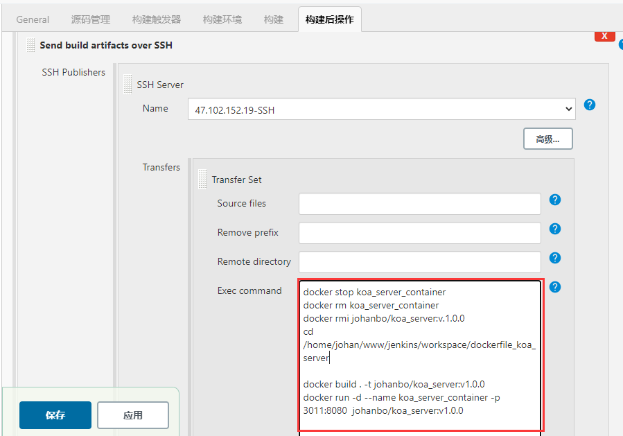 docker stop koa_server_containerdocker rm koa_server_containerdocker rmi johanbo/koa_server:v.1.0.0cd /home/johan/www/jenkins/workspace/dockerfile_koa_serverdocker build . -t johanbo/koa_server:v1.0.0docker run -d --name koa_server_container -p 3011:3010 johanbo/koa_server:v1.0.0
