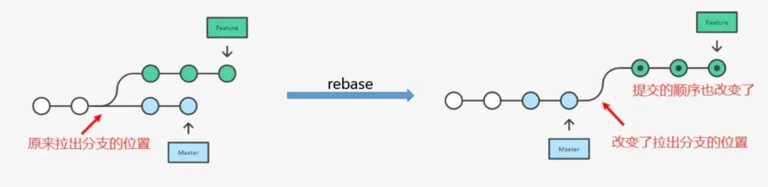 如下图所示,经过 rebase 后提交历史的变化情况