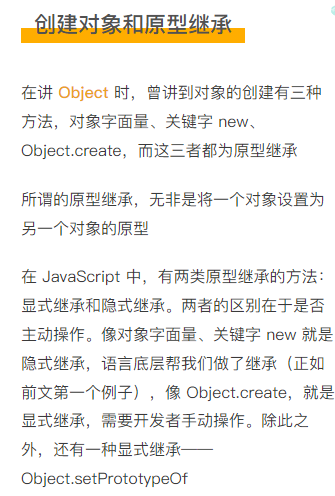 从发展的角度看,Object.create 是 ES5 出现,但它不满足两个对象设置原型时,ES6 就提供了新的方法——Object.setPrototypeOf。但无论如何,它们都是后来因为个别需求而新增的 API,无法与 JavaScript 一开始采用的隐式继承相媲美