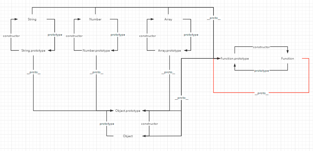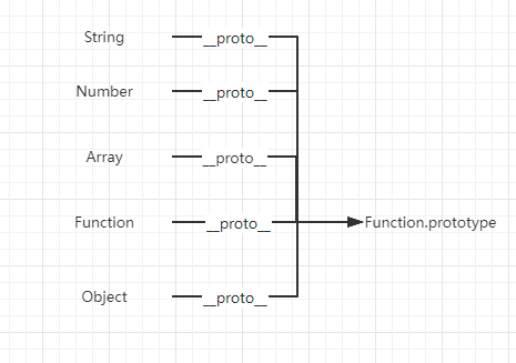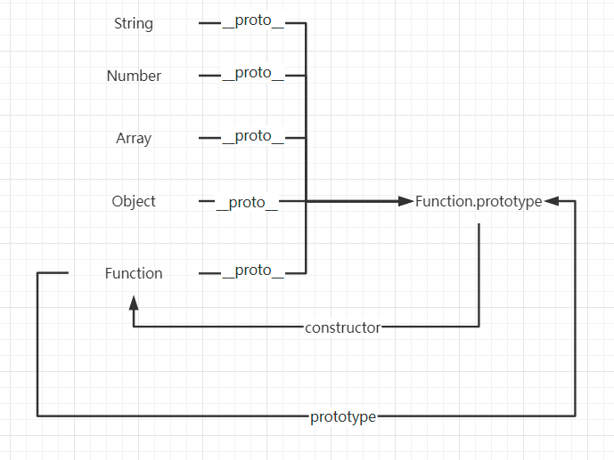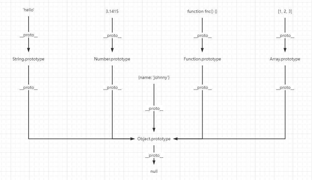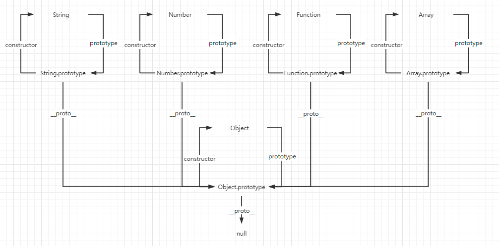 String.prototype.__proto__ === Object.prototype // trueNumber.prototype.__proto__ === Object.prototype // trueArray.prototype.__proto__ === Object.prototype // trueFunction.prototype.__proto__ === Object.prototype // trueObject.prototype.__proto__ === null // truevar obj = {};var arr = [];function func() {}obj.__proto__ === Object.prototype // truearr.__proto__.__proto__ === Object.prototype // true// arr.__proto__ 指向 Array.prototypefunc.__proto__.__proto__ === Object.prototype // true// func.__proto__ 指向 Function.prototype