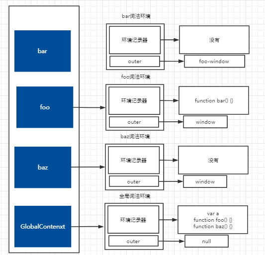 bar 的 outer 指向 foo 执行上下文, foo 的 outer 指向 window,变量先从当前执行作用域查找变量,如果找不到,就引着 outer 继续查找。这一过程中,bar 作用域—foo 作用域—window 作用域。
