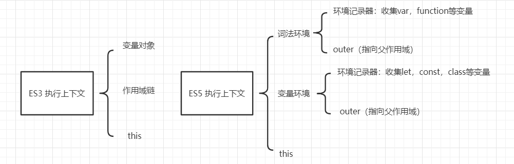 在 ES5 时,执行上下文则包括词法环境、变量环境、this。其中词法环境或者变量环境都是由用于环境记录器和 outer 对象组成,其中 outer 指向父级作用域,环境记录器记录自由变量