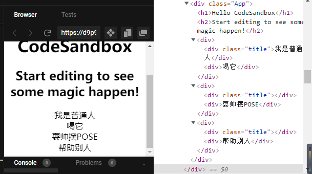 import "./styles.css";import React from "react";import Wrapper from "./Wrapper";class A extends React.Component { render() { return <div>喝它</div>; }}class B extends React.Component { render() { return <div>耍帅摆POSE</div>; }}class C extends React.Component { render() { return <div>帮助别人</div>; }}const AA = Wrapper(A);const BB = Wrapper(B);const CC = Wrapper(C);export default function App() { return ( <div className="App"> <h1>Hello CodeSandbox</h1> <h2>Start editing to see some magic happen!</h2> <AA title="我是普通人" /> <BB /> <CC /> </div> );}