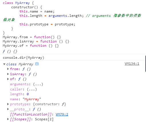 class MyArray { constructor() { this.name = name; this.length = arguments.length; // arguments 指参数中的类数组对象 this.prototype = prototype; }}MyArray.from = function () {};MyArray.isArray = function () {};MyArray.of = function () {};