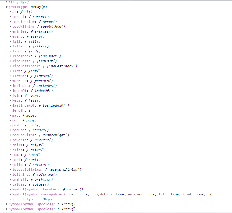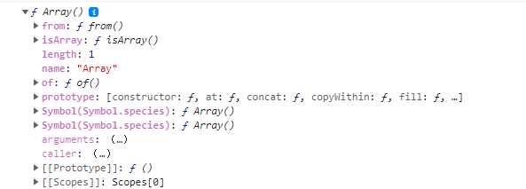 除去 arguments、caller、Symbol、get Symbol 以及 [[Scopes]] 外,剩下的都是我们非常熟悉的数组拥有的静态函数,可以看出,有 length、name 等静态属性,还有 from、isArray、of 等静态方法