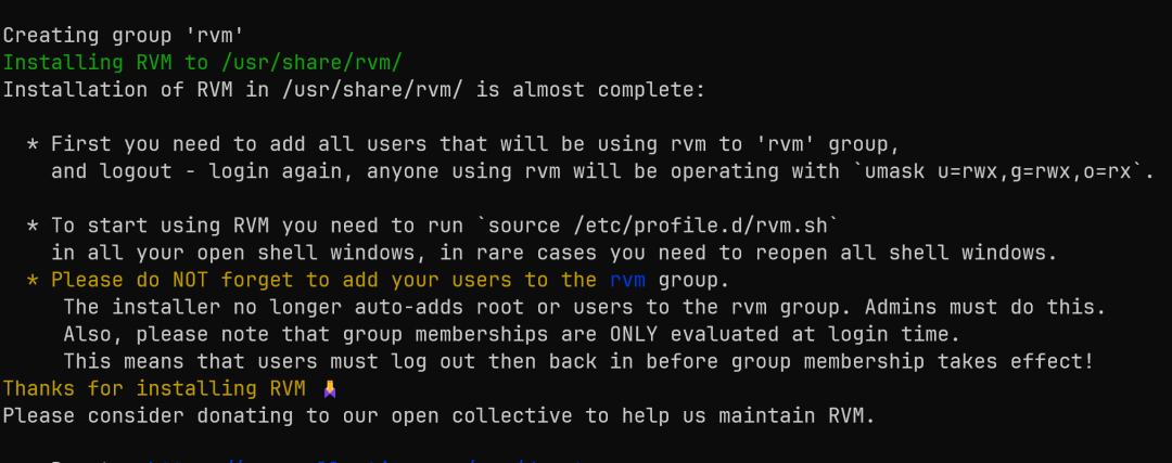 # 当 rvm 安装好后,看下图的提示操作sudo usermod -a -G rvm johan # 将当前用户添加到 rvm 组中su root # 切换到root,相当于先注销 johansu johan # 切换会johan,相当于登录 johansource /etc/profile.d/rvm.sh # 让命令生效