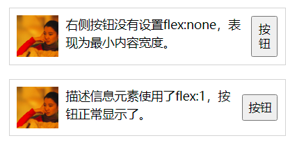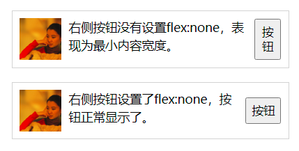 当 flex 子项的宽度就是内容的宽度,且内容永远不会换行,则适合使用 flex:none,例如如下的场景,图片和按钮固定长度,内容弹性