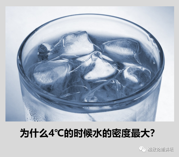 比如说,大部分物质从液体变成固体的时候,它的体积会减小。但是水结成冰的时候,它的体积反而会变大,密度会减小,而且水在4℃的时候密度最大。