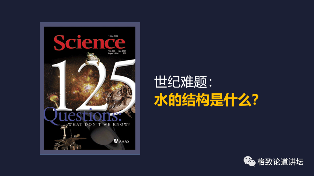因此,《科学》在创刊125周年的时候,提出了本世纪最具挑战性的125个科学问题,其中一个问题就是“水的结构是什么”,这说明水的结构实际上是了解水的性质最关键的一环。