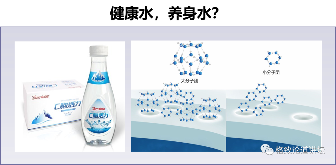 似乎商家已经解决了这个问题,他们已经知道液态水的结构到底是什么,或者是说能够通过某种手段让液态水里的水分子聚成小团,然后让这个小团更容易通过我们的细胞膜被人体吸收,促进新陈代谢。