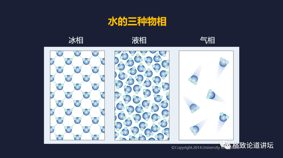 在低温的时候它是固体、是冰相,冰相里面的水分子都规规矩矩地排在自己的位置上,形成一个规则的、有序的网络结构。