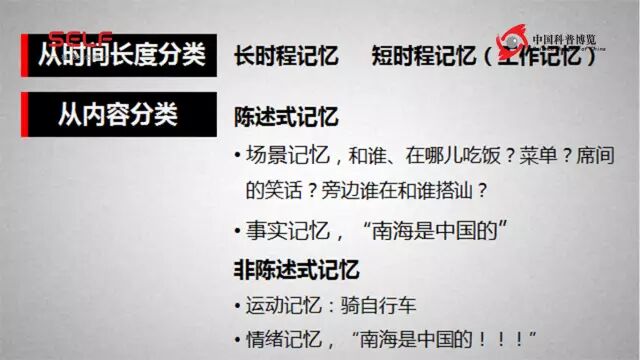 在长时程记忆里面又分成“陈述式记忆”和“非陈述式记忆”。HM的主要是陈述式记忆出问题,也就是说这种可以被陈述出来的事情,不管是事实还是一个场景──我昨天和谁一块吃饭、说什么话呀、吃什么东西……这些时间、地点、人物,这种“场景记忆”。海马是很重要的,或者是“事实记忆”,对吧?“南海是中国的。”这是一个是事实记忆。