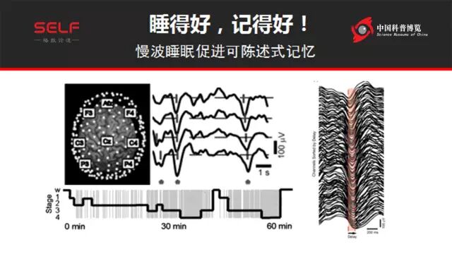 还要“睡得好”,如果记录头皮脑电的话,那么在人睡眠的时候,可以看到“慢波”,这边显示的每一个小的波动就是一个慢波,在全脑里面是很大尺度的神经元活动。德国科学家发现,如果你在人睡眠的时候,在脑子里面引发这种慢波,那么可以记得更好。他实际上让学生晚上学习外语,然后在睡觉时候去电刺激脑子,引起更多慢波,第二天早上起来问他学的词汇还记住多少?如果你做过电刺激,那么学得更多。我并不是建议大家晚上回去以后就电刺激自己脑子,因为你并不一定总要记住昨天晚上的事情,对吧?