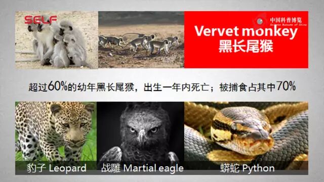 接下来我想举一个更明确的例子,来说明学习记忆对生存的必要性。这边展示的是黑长尾猴,它生活在非洲,大概3到5公斤,是很小的一类猴子。在野外,黑长尾猴的生存相当不易,一岁之内的小的黑长尾猴有60%会死亡,其中至少70%是来自于捕食者。