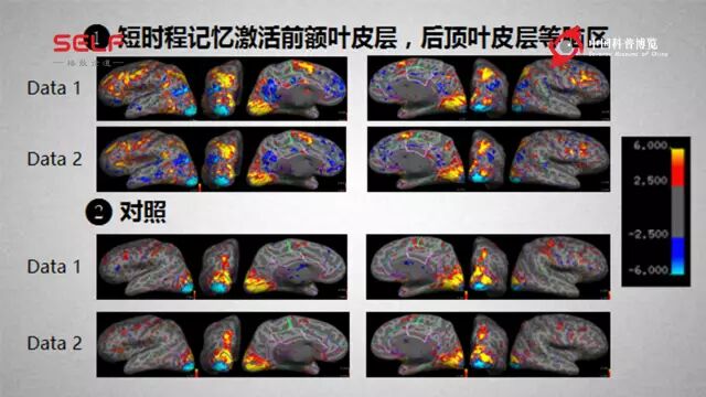 当我自己躺在我们的所里面的核磁功能共振成像仪器里面,我自己做刚才这个任务,这是我自己的脑子的反应,至少这个脑子看起来还比较正常。如果侧过来看的话,额叶顶叶这两个脑区在我做工作记忆的任务的时候──需要短时间的记住一个信息──它会被激活,就颜色比较热的这种地方,颜色比较蓝的地方就是被抑制的地方,所以我们的脑子其实有很多特定的脑区,是在帮助我们做这种行为的。