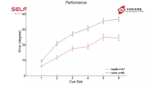 或者是病人──比如说精神分裂症患者──来做这样的事情,可以看到X轴就是给不同的样本的数量;Y轴是出现错误的几率,即使正常的红色的线也是随着要我记得信息越来越多,我出错的几率会越大,对吧?这是正常的。但是精神分裂症患者,他们出的错误就更高。