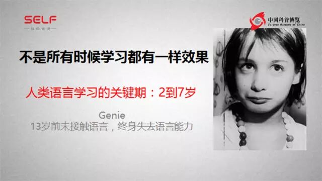 我还想说一个“记忆的极限”,不是所有时候的学习都是一样的效果。我们的语言能力,大家都认为是很自然,对不对?每个人都会说话。这个是依赖于所谓关键期的,在2到7岁的时候,我们必须要经历语言这个经验,如果这时候没有语言经验,那么结果会非常的可怕。