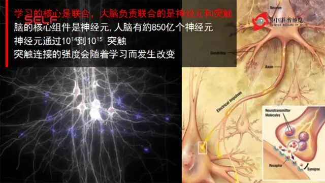 神经元长得很漂亮,图上左边就是显示了几个神经元的样子,你看它们长得很大的、天线一样的形状,就是接受输入的地方;它们还长出很纤细的、很长的叫“轴突”的这种结构,来传输自己的这个信号,那么接受这个信号的地方就叫做“突触”。