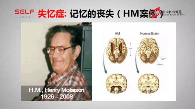 有一个人叫做HM,他因为严重的癫痫,所以在他20多岁左右的时候,医生把他会产生癫痫的部分脑区摘除掉了,就癫痫灶拿掉了,几乎全部海马都给拿掉了,人们马上发现做完手术之后,HM这个病人他已经不再是HM,他无法形成新的记忆,在手术之前的记忆还在,没有问题,但是新的记忆无法形成了,所以后来照顾他的新进来的护士医生,每次见到他都必须向他自我介绍;即使你出了房间去喝了杯咖啡,五分钟以后再回来,他就完全忘记你是谁了。