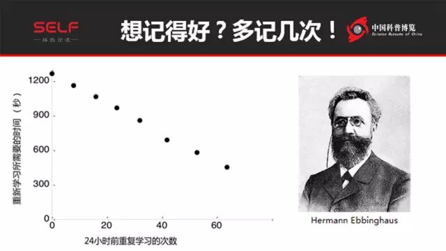 在座更关注的可能是“学习记忆怎么被提高”对不对?我想给大家一个好的消息,学习记忆是可以提高的!怎么被提高呢?就是“记好多次”。这是一个非常严肃的结论。右边图这个人叫做Ebbinghaus,他是第一个严肃的研究记忆的心理学的一个科学家,他发现:底下x轴显示的是我在一天之前,学习一些材料,我所做的学习次数;Y轴就是在一天之后,我重新学习又要需要多长时间。可以看到如果你学的次数越多,那么第二天你就花的时间越少来学会,就说明你学习次数多,就记得好,对不对?所以勤奋是必要的。
