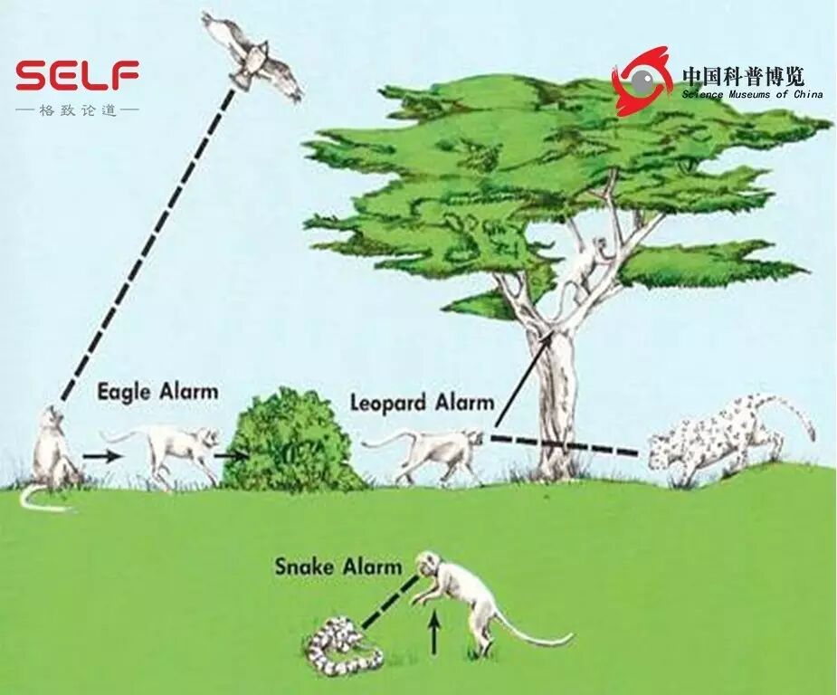 针对这三类不同的捕食者,黑长尾猴发展出了非常有效的警告性的呼叫声。这里我想请工作人员来播放这个声音,当黑长尾猴看到豹子的时候,它会发出这样的警告声音,黑长尾猴听到同伴这样的叫声的时候,它的第一反应要上树,为什么?