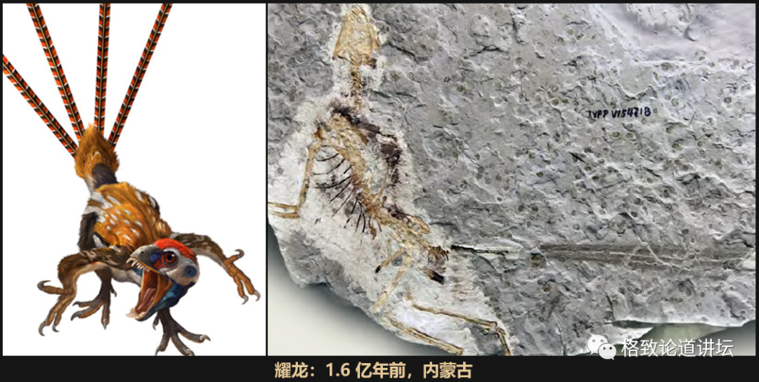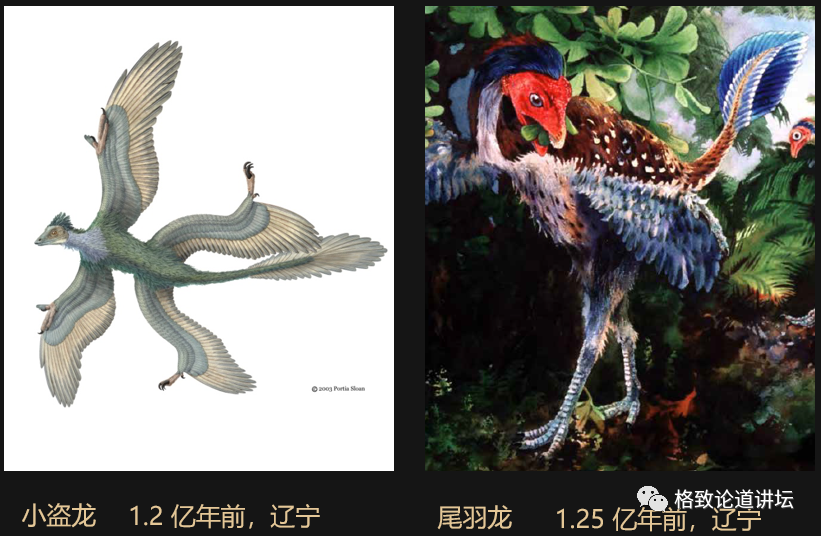 这是一个会飞的恐龙——小盗龙,它的羽毛已经是片状的,已经像一个鸟的羽毛一样了?和最开始出现的近鸟龙非常相似。