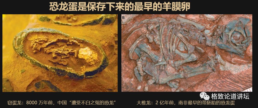 而右边是一个鸡蛋,在我们古生物学家眼里,这个蛋指的是羊膜卵。