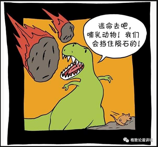 这张卡通图上显示,前边有一个小耗子一样的动物,这个恐龙说,“逃命去吧,哺乳动物,我来帮你挡住这个陨石”——其实是一颗陨石,没这么多颗。