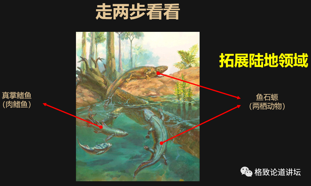 为什么呢?我们说这些长了胳膊腿的动物已经爬上陆地——当然水里头还有鱼呢,它们一直生活在那里。