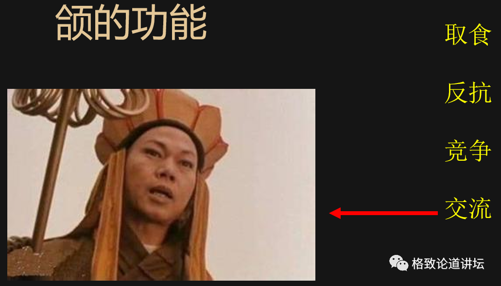 第四,就像唐僧,它要交流,要不然的话它这嘴要是不停动弹,那就是念紧箍咒了。这就是颌的功能。